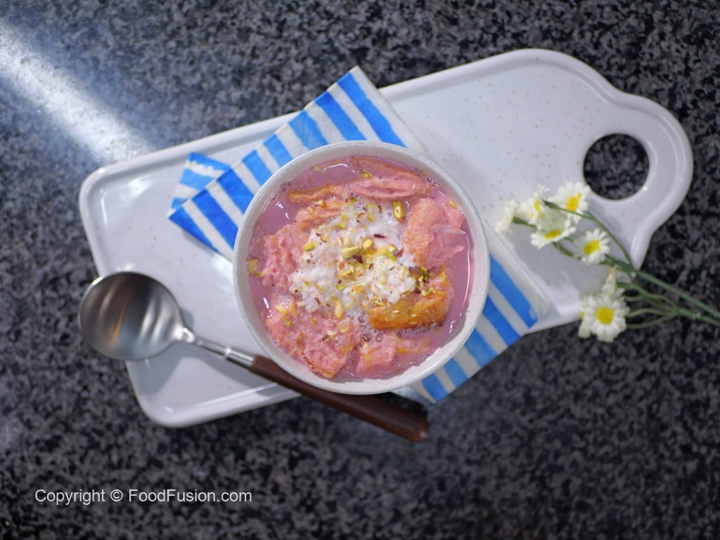 -Ek cooking pot mein doodh dalein, boil karen, phir tayar pink tea concentrate dalein, mix karen, aur akhir mein pink food color dalein aur mix karen.