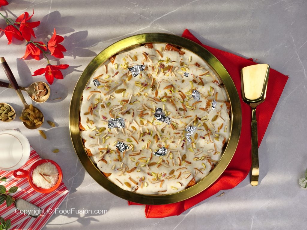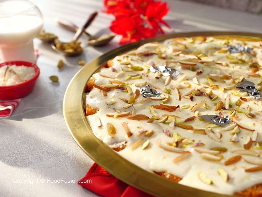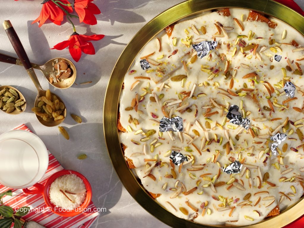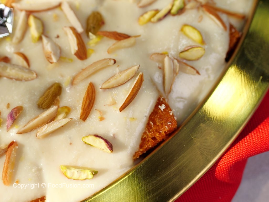 -Ab fried bread slices ko sheera mein dip karein aur serving dish mein assemble ker lein.