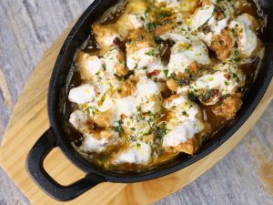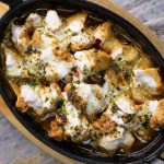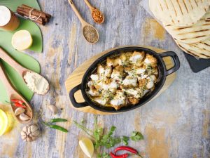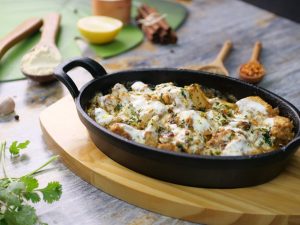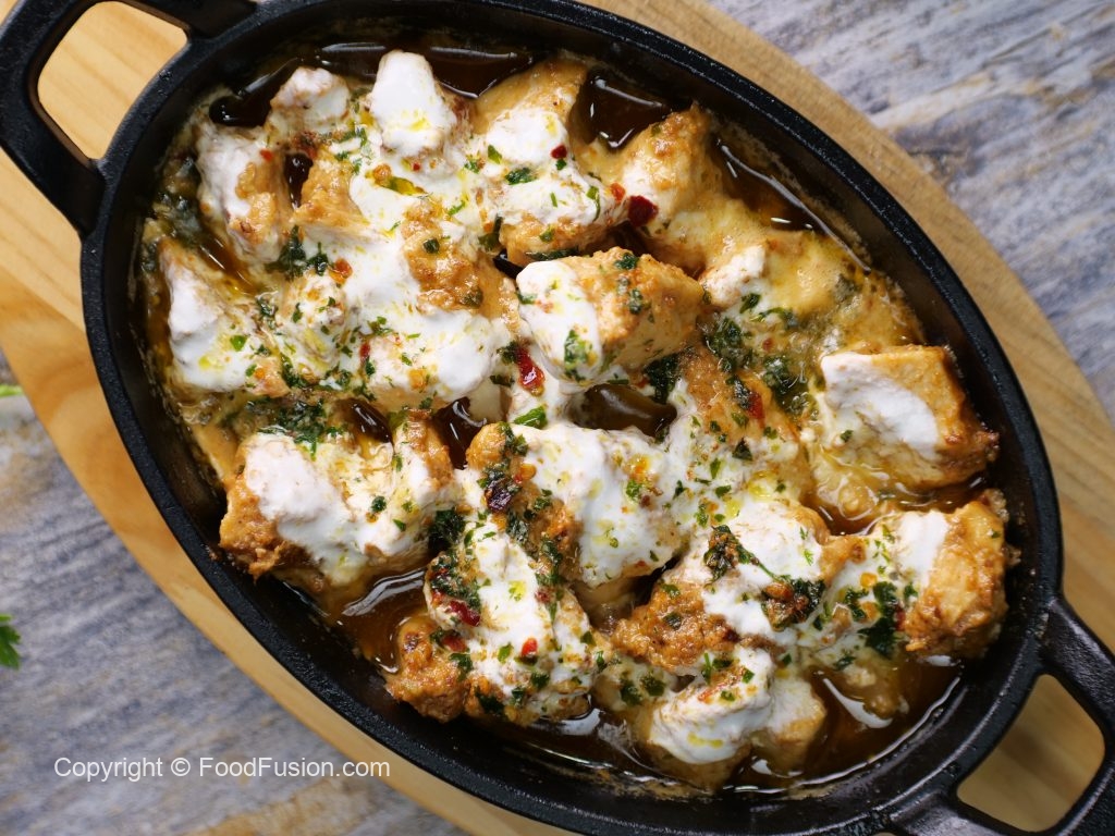Garam sizzler pan mein chicken boti,dahi aur flavored butter dal ker serve karein!