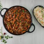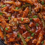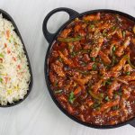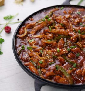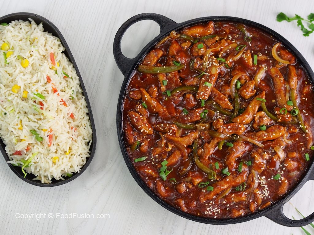 -Heat sizzling pan,pour chicken & garnish with sesame seeds,spring onion & serve with fried rice.