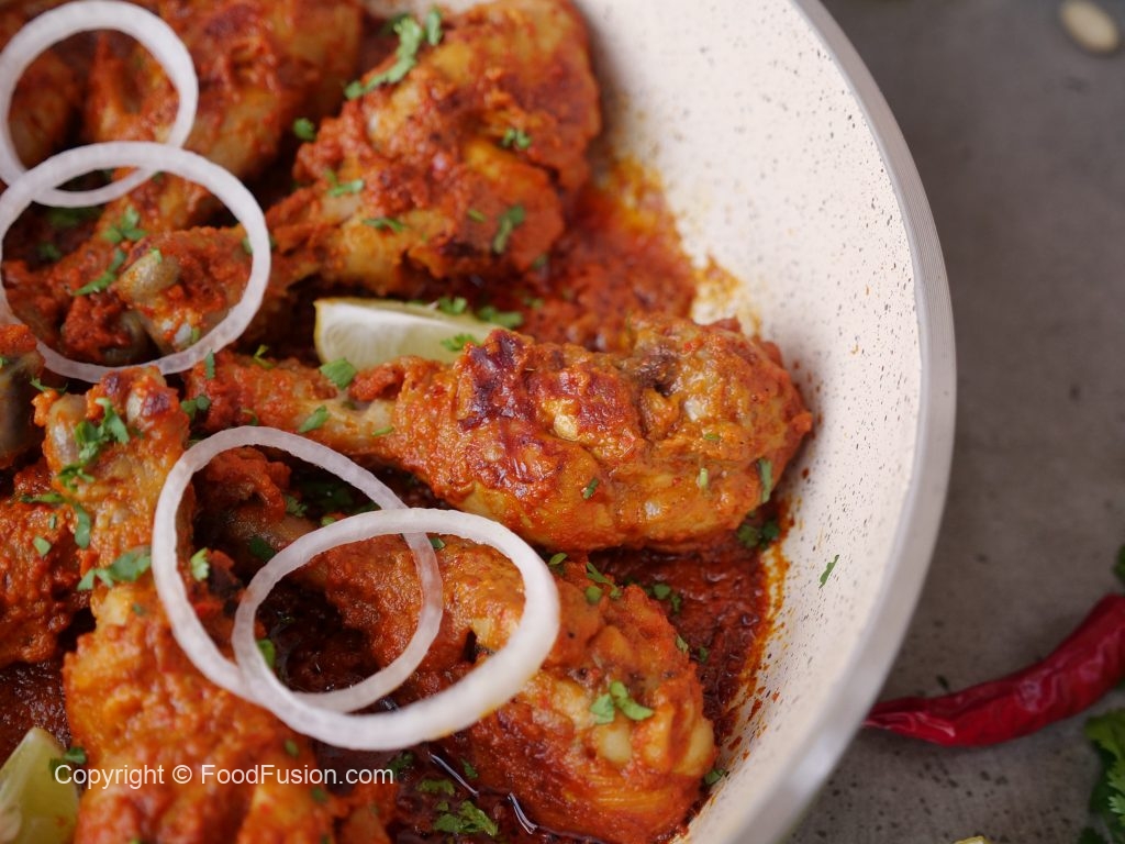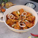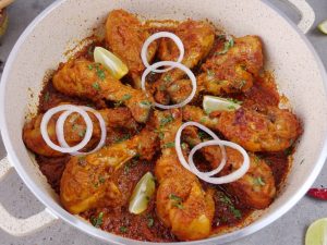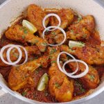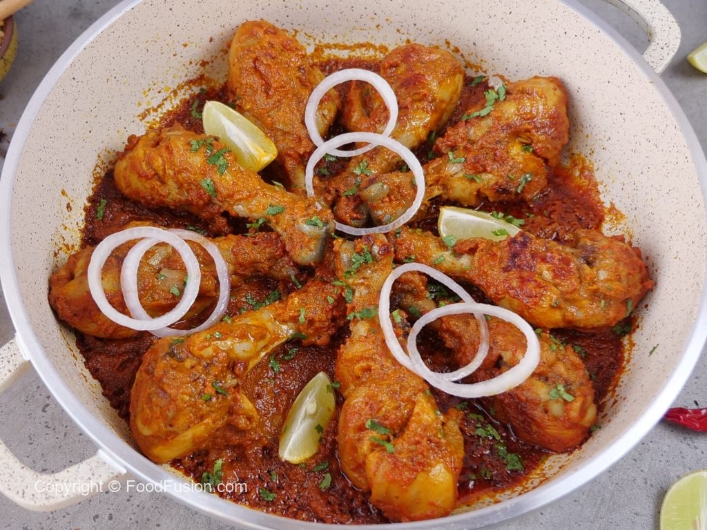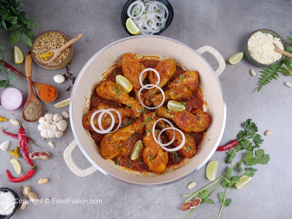 -Karahi mein cooking oil aur marinated drumsticks dal ker remaining marinade laga lein aur dhak ker halki ancch per 12-15 minutes kliya paka lein aur bech bech mein sides ko tturm ker lein aur remaining marinade laga lein ker dhak dein aur halki ancch per gul janay tak paka lein (12-15 minutes).