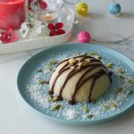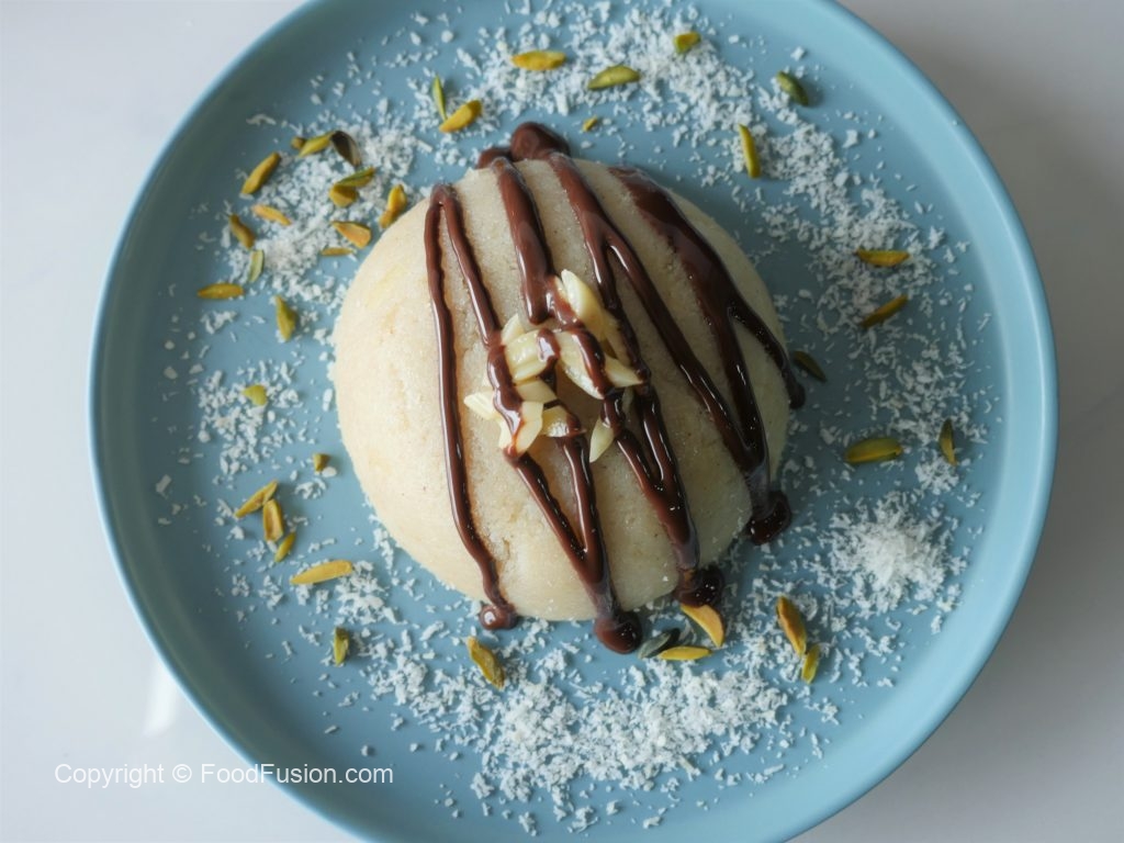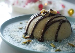 Add a scoop of king kulfa and cover with semolina halwa then flip on serving plate and garnish with desiccated coconut,pistachios,fried almonds,chocolate sauce & serve!