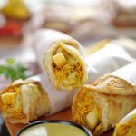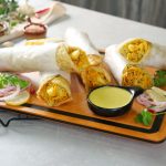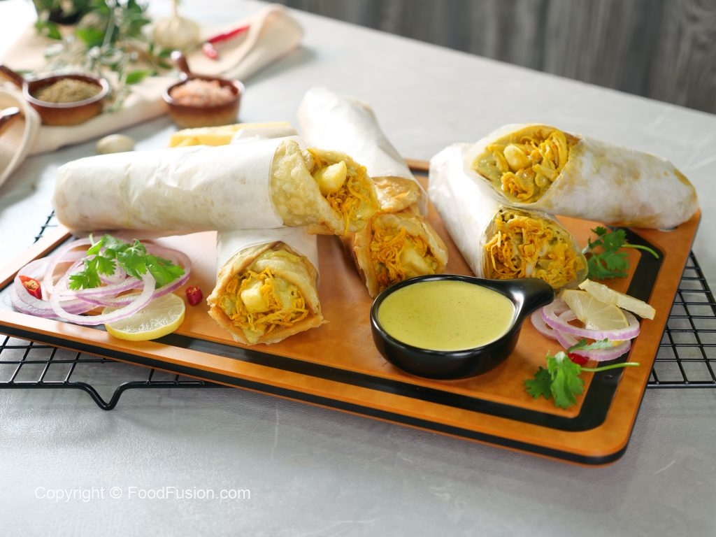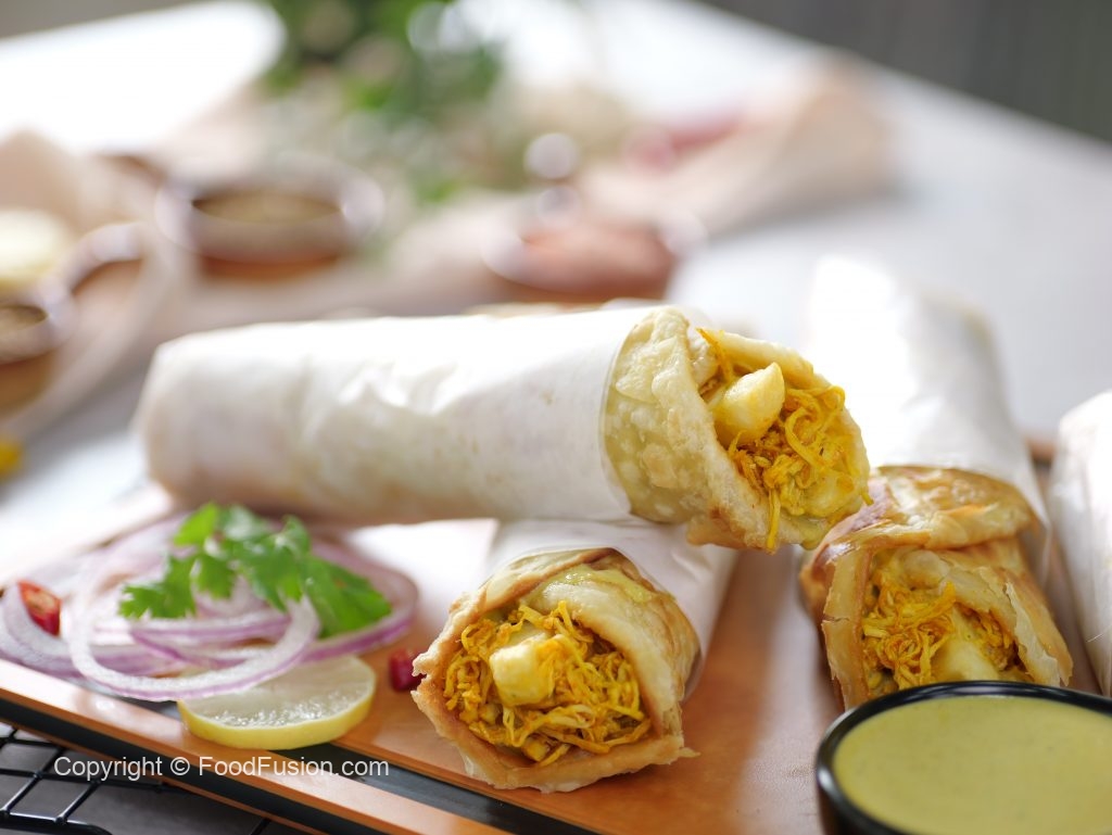 -On a paratha,add & spread prepared sauce,add chicken filling,french fries,prepared sauce & roll it.