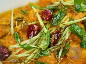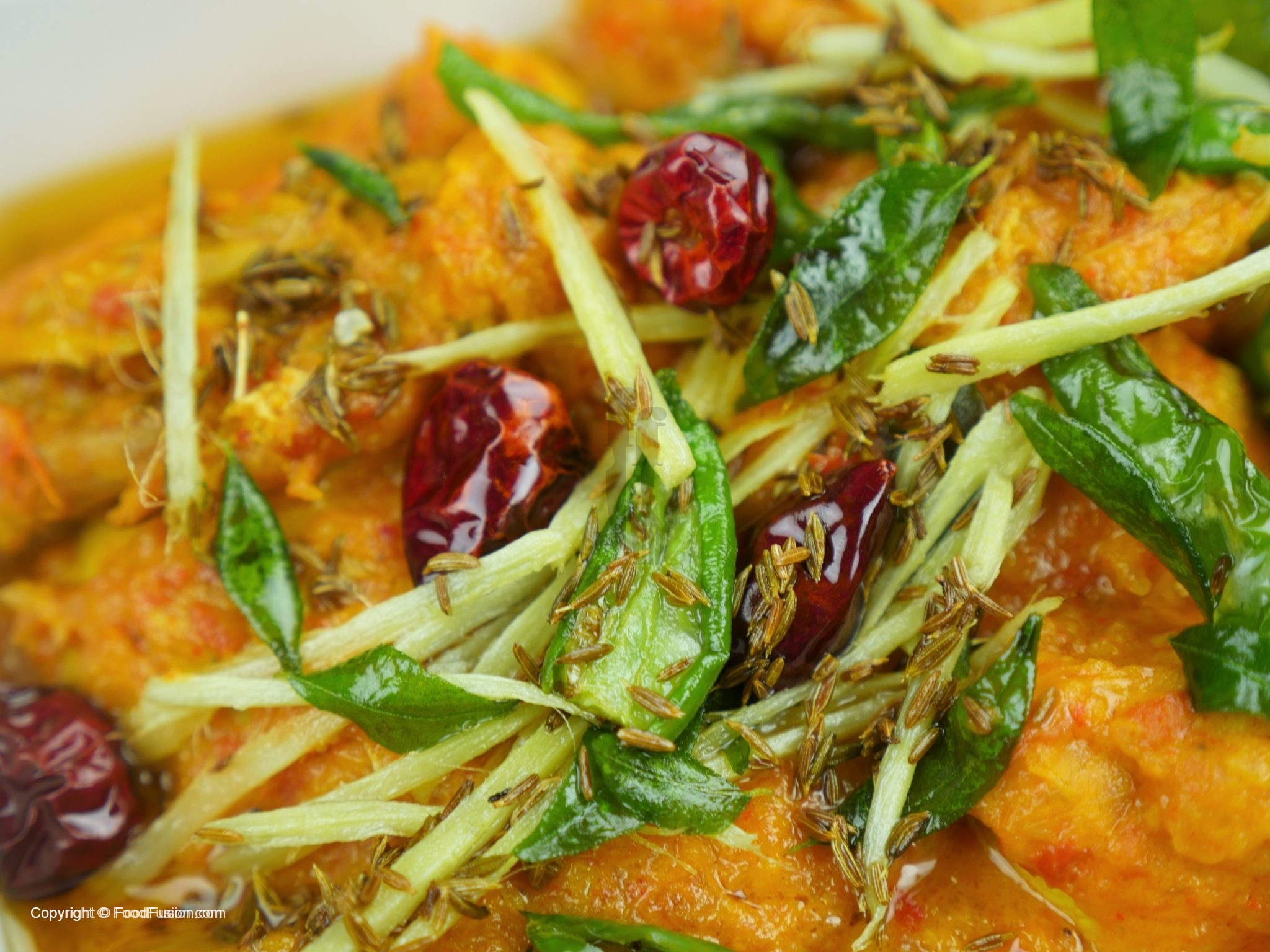 For tarka, in frying pan,add oil,green chili,button red chili,cumin seeds,ginger julienne,curry leaves and fry until light brown.