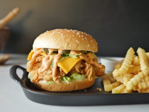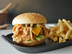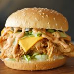 On burger bun,add mayonnaise,iceberg,crispy fried chicken piece,cheese slice,iceberg,jalapenos, prepared burger sauce and top with another bun.