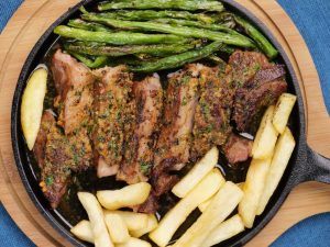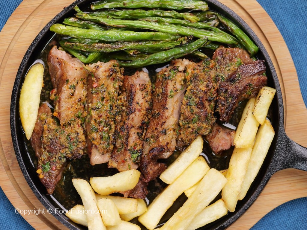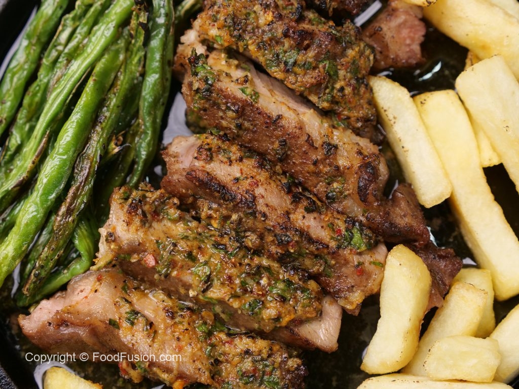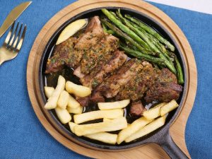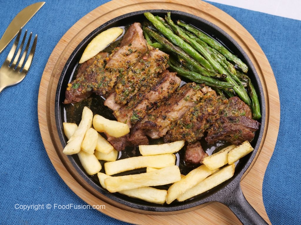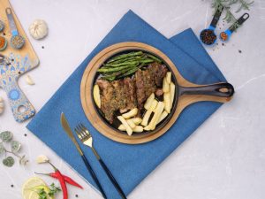 -Add seasoned steak piece,press with patty press to lock the juices,flip,repeat the process & cook on medium flame from both sides until done,rest it for 2 minutes then cut into pieces.
