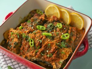Dhak dein aur bohat halki ancch per 20-25 minutes kliya steam cook ker lein aur bech bech mein gravy ko fish ka upper daltey rahein phir dubara dhak dein aur 3-4 minutes kliya paka lein.