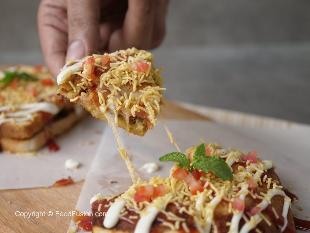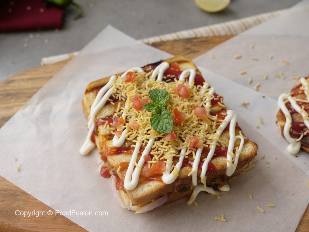 Sandwich ko four pieces mein cut ker lein,tomato ketchup,mayonnaise,sev nimco aur tamatar dal ker serve karein!