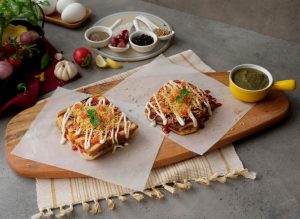 Place tomato slices,onion rings,mozzarella cheese & drizzle tomato ketchup.