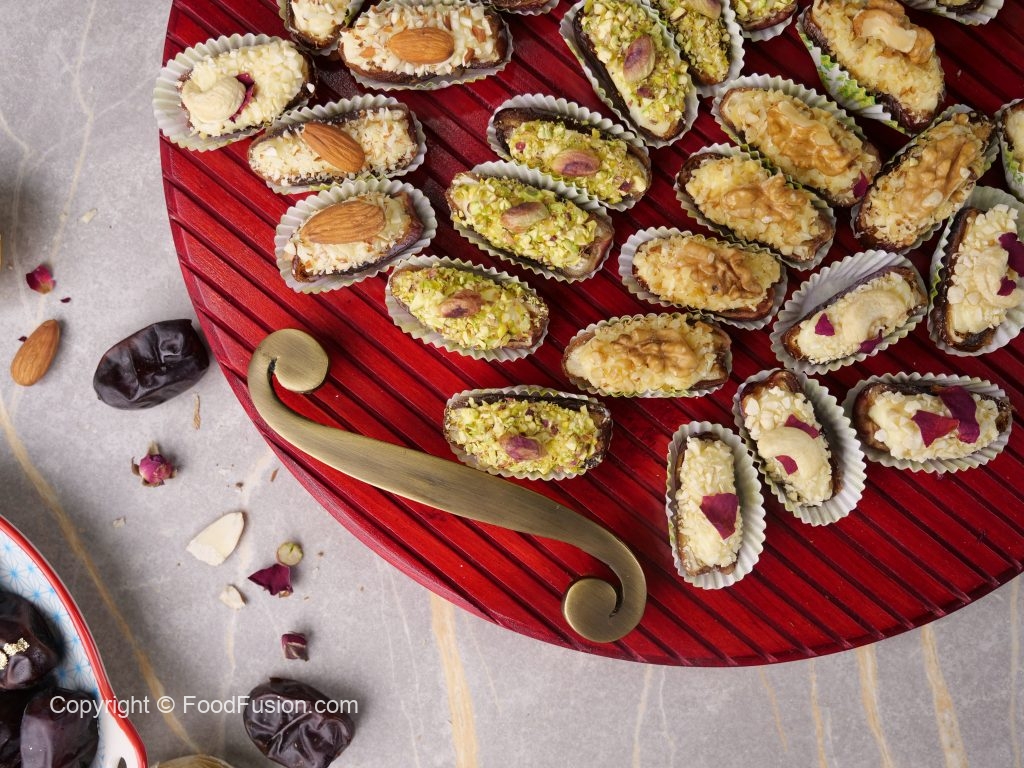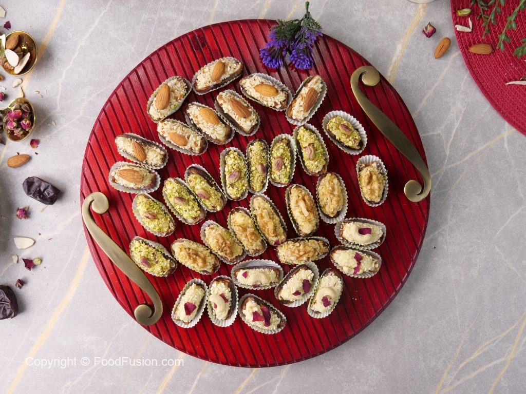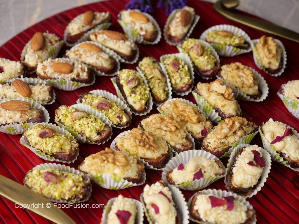 Cut dates in half,deseed them & stuff both parts with prepared creamy stuffing.