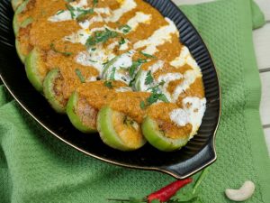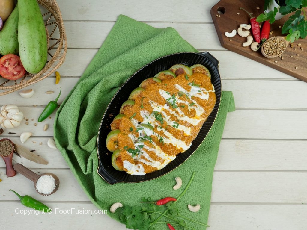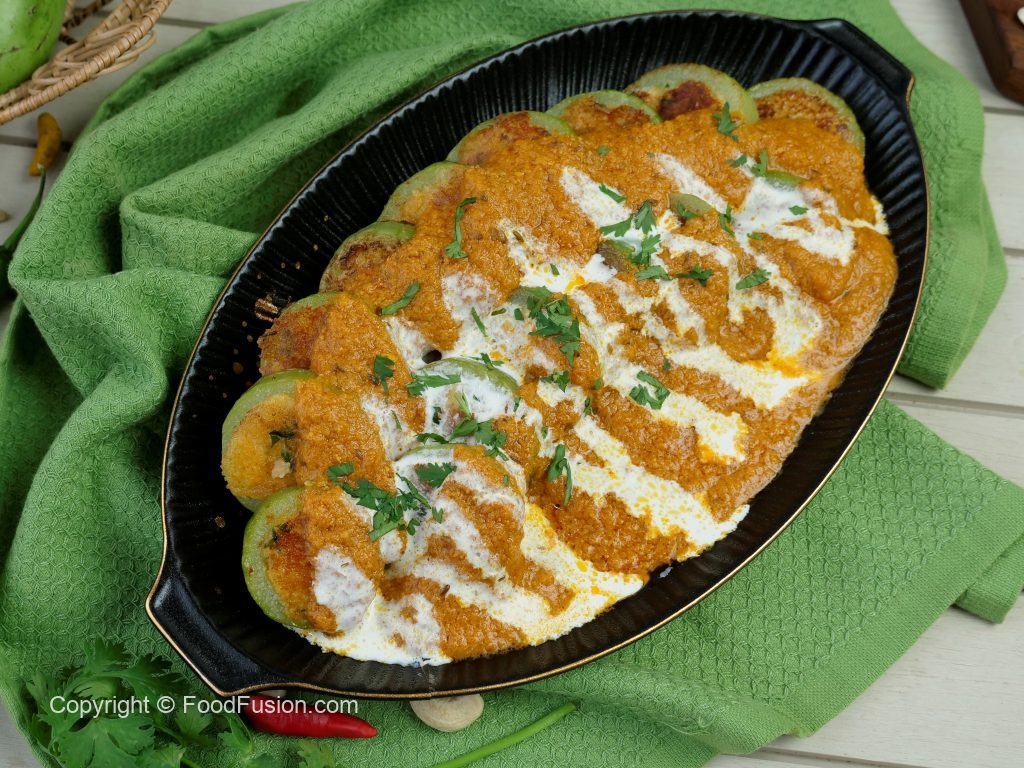 In a serving dish,place fried stuffed bottle gourd slices and pour prepared gravy on top.