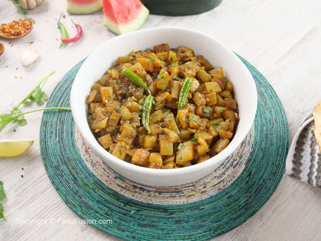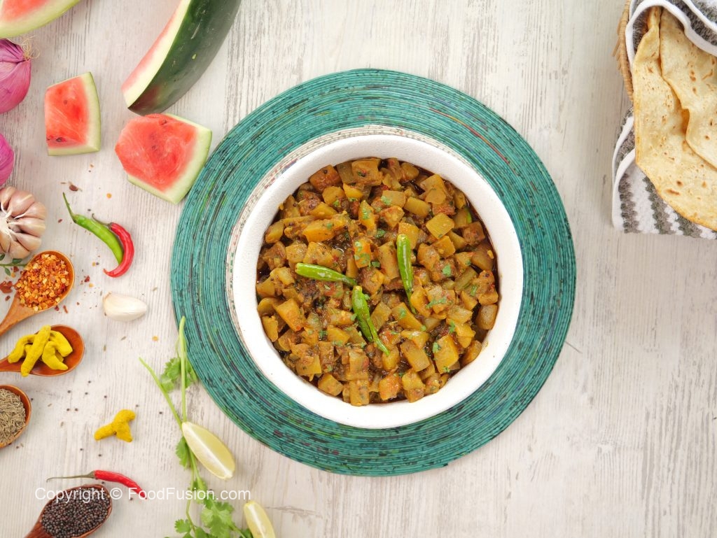 -Cut watermelon,remove red part & peel watermelon rind with the help of peeler.