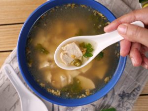 -Take out chicken pieces,shred the chicken from bones & cut fillet into thin pieces then strain the soup & set aside.
