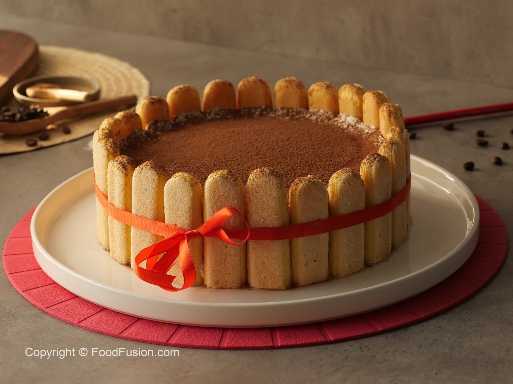 Spread prepared frosting all over the cake,set ladyfinger biscuits on the sides of the cake & tie a ribbon to decorate it.
