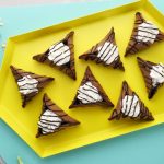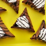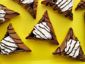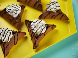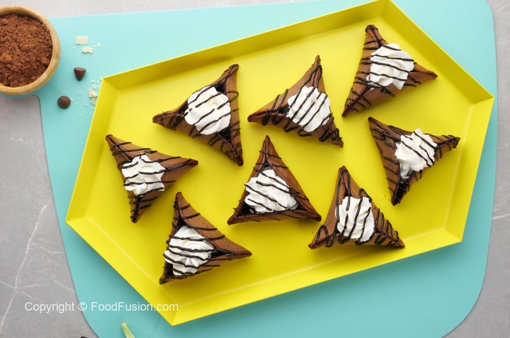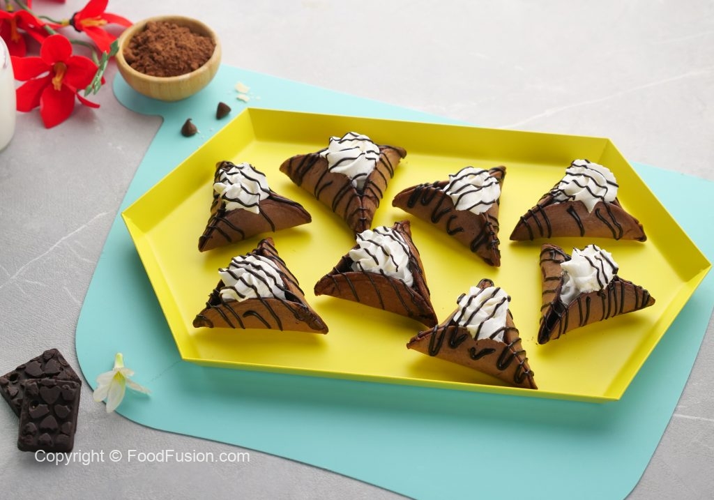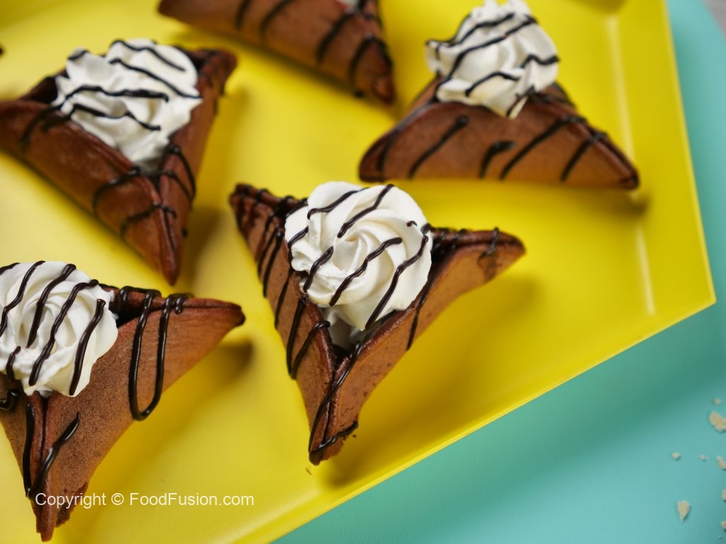 -Pancake ko baking paper per rakh dein aur corners ko fold ker ka triangle shape bana lein aur few seconds kliya hold karein ta ka stick ho jaye (makes 11-12).