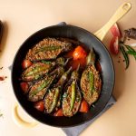 Peel eggplants alternatively from the skin lengthways and slit from the center/middle lengthways.
