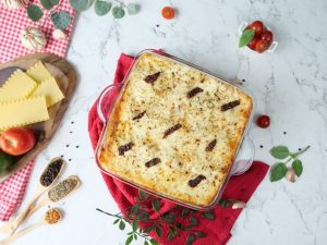 -In baking dish,add & spread pizza sauce,place lasagna sheets,pizza sauce,prepared tuscan chicken sauce,cheddar,cheese,mozzarella cheese,lasagna sheets,pizza sauce,prepared tuscan chicken sauce, cheddar cheese,mozzarella cheese,lasagna sheets,pizza sauce,prepared tuscan chicken sauce, cheddar cheese,mozzarella cheese,dried oregano,red chilli crushed & sundried tomatoes.