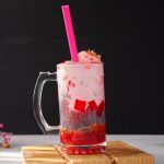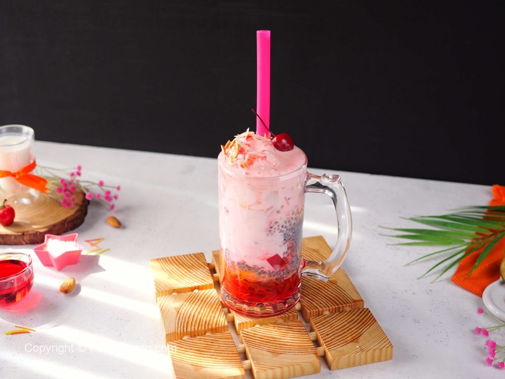 -In a serving glass add rose syrup, colourful vermicelli, soaked basil seeds, tutti frutti frozen dessert, prepared red jelly, apple, sapodilla, almonds, prepared rabri milk mixture, tutti frutti frozen dessert, garnish with rose syrup, almond, cherry & serve!