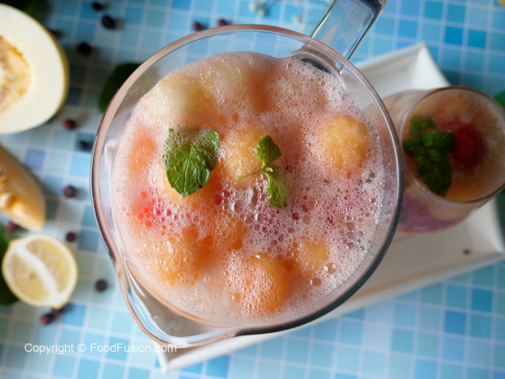 Pitcher mein melon balls,watermelon balls,honeydew melon balls,tayyar juice,7up aur podina dal ker stir ker lein & serve karein!