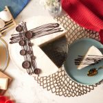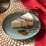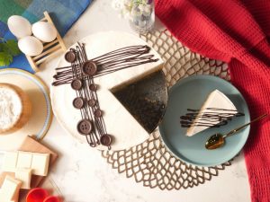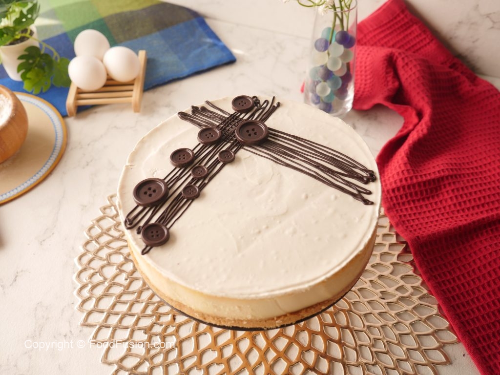 Cheesecake ko melted dark chocolate aur chocolate button sa decorate ker len desired slices mein cut ker ka serve karein!