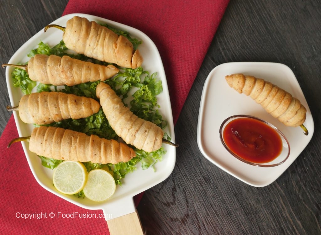 Strip lein aur pani laga ker green chili per twist ker ka lapeet lein (makes 6-8) aur 15 minutes kliya freeze ker lein.