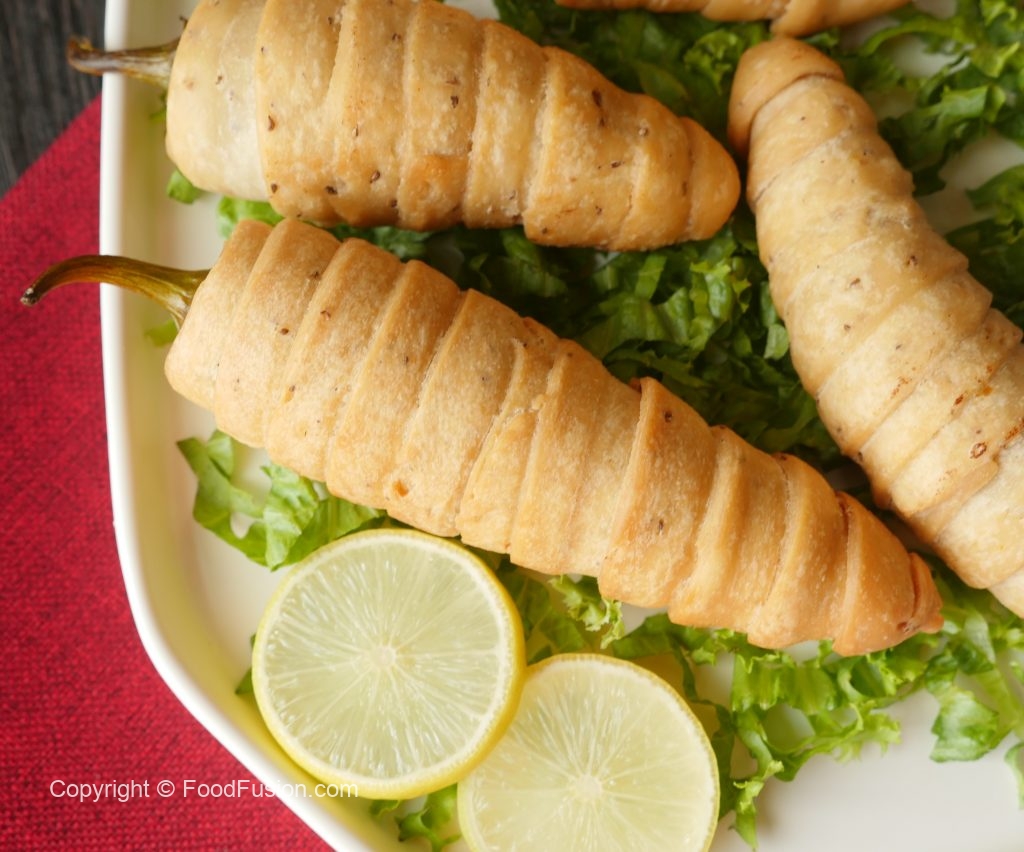 Stuffed green chilies with achari potato filling & set aside.